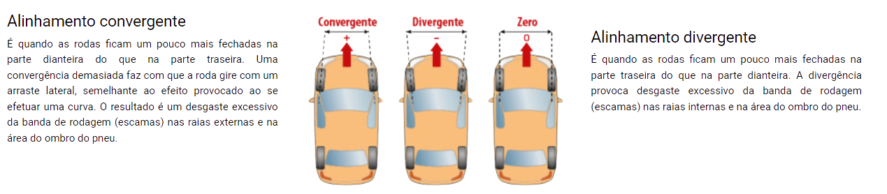 É quando as rodas ficam um pouco mais fechadas na parte traseira do que na parte dianteira. A divergência provoca desgaste excessivo da banda de rodagem (escamas) nas raias internas e na área do ombro do pneu.